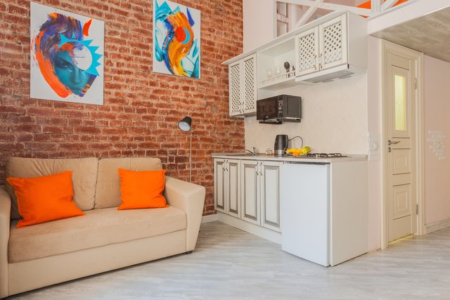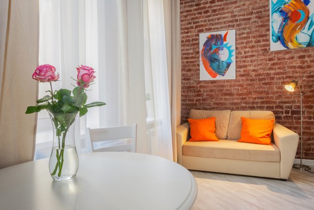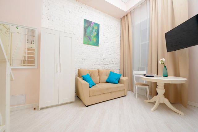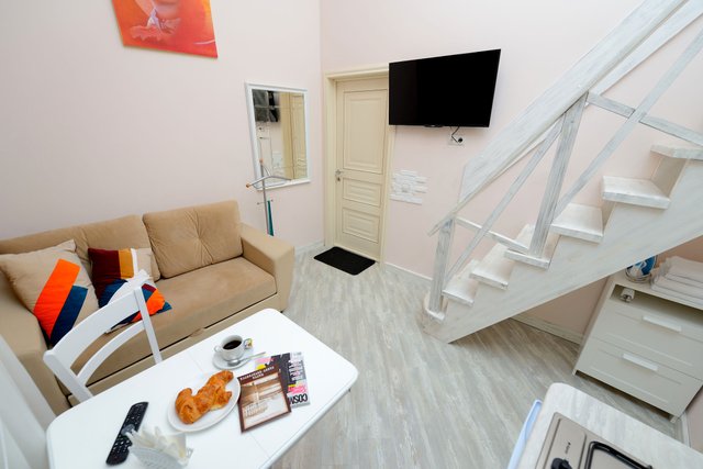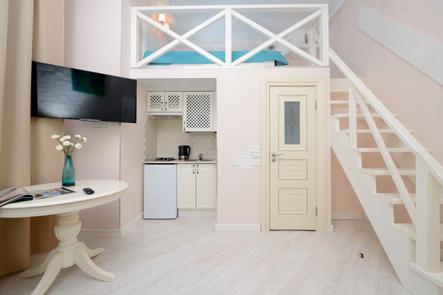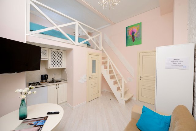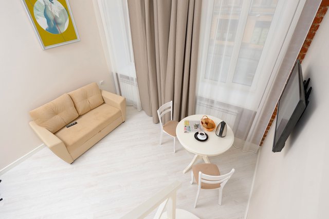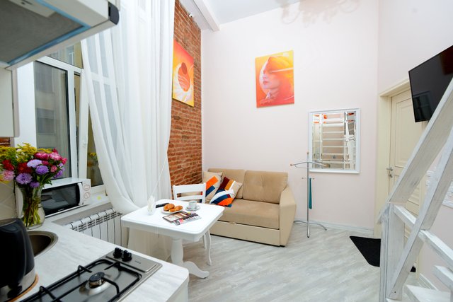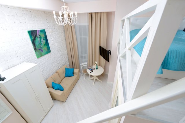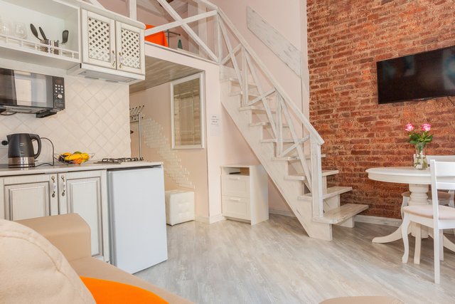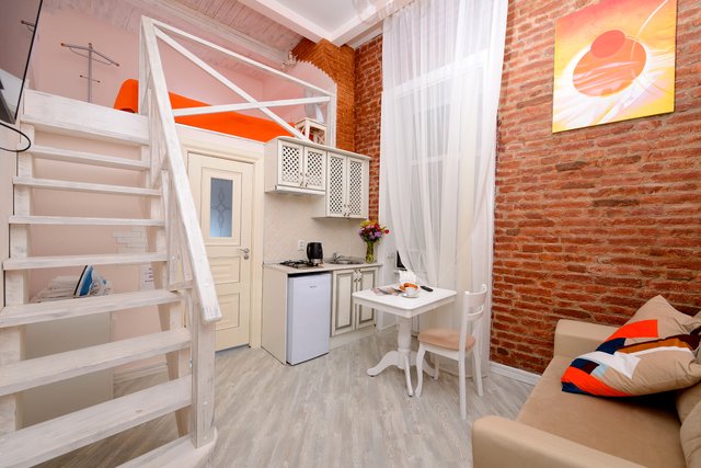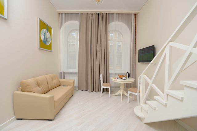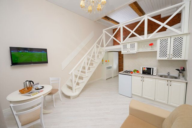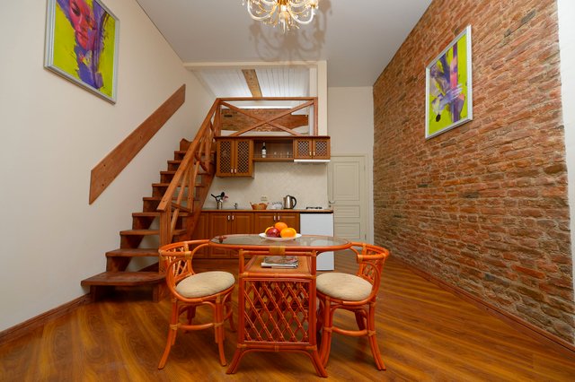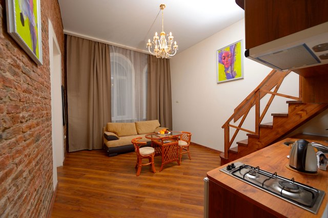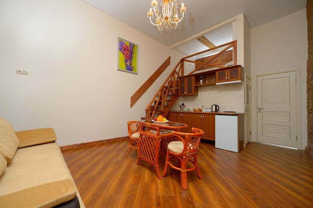 Апартаменты в историческом центре города, расположен на втором этаже доходного дома. Двухуровневые номера, высокие потолки.