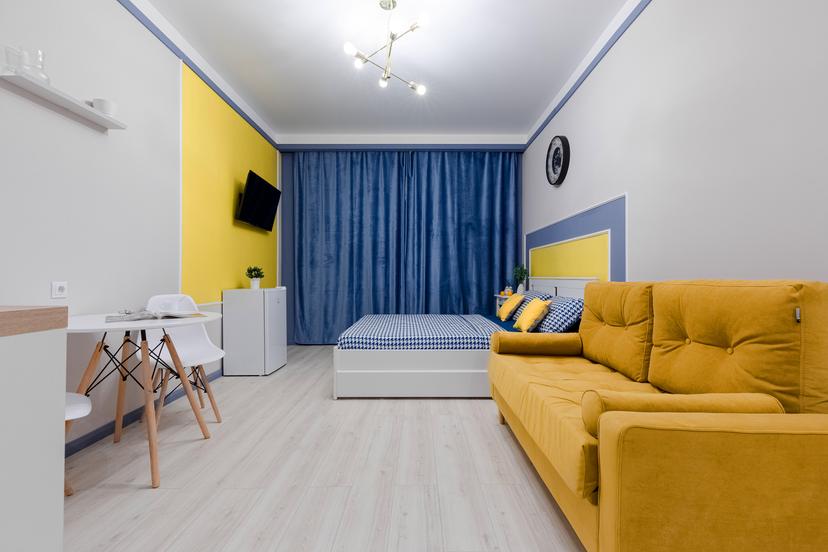 - Просторный номер с двуспальной кроватью и дополнительным диваном.