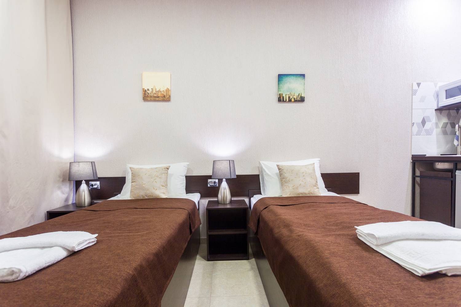 Интерьер выполнен в однотонных спокойных тонах, а номера имеют хорошую шумоизоляцию. Приехать к нам можно в любое время суток — у нас установлена система электронных замков.