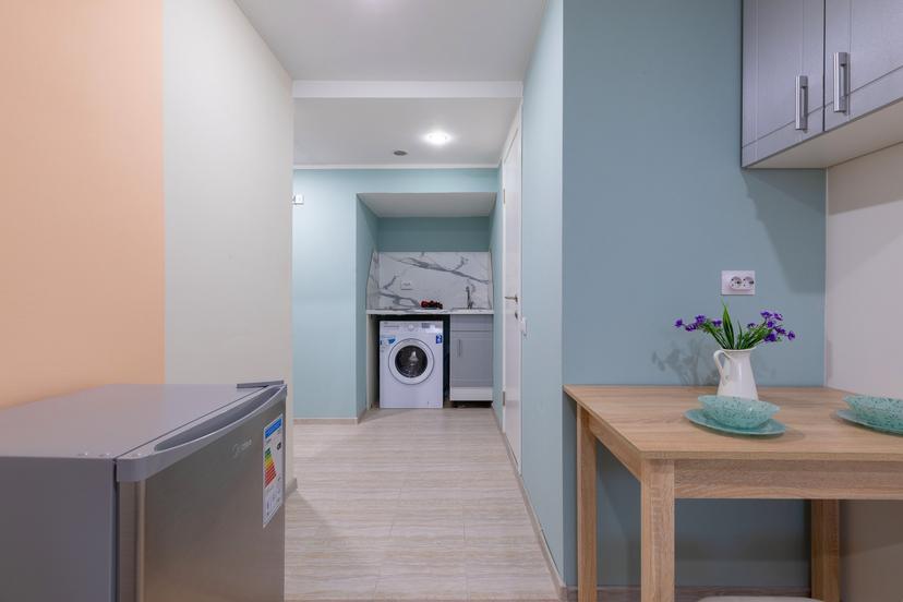 ▪️Кухонная зона с посудой, принадлежностями для готовки и необходимой техникой: электроплита, чайник, холодильник