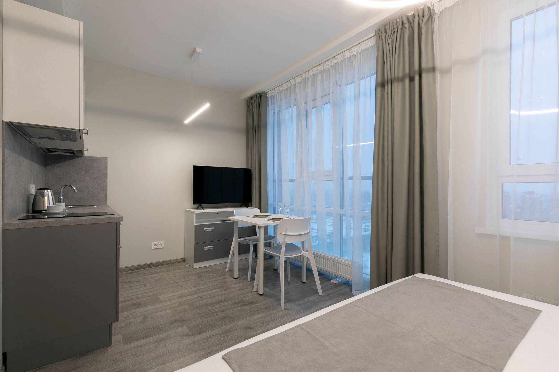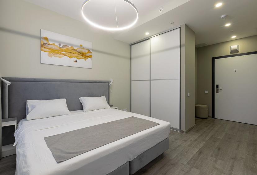 Номера-студии с панорамными окнами в пол с видом на город. 19 этаж.