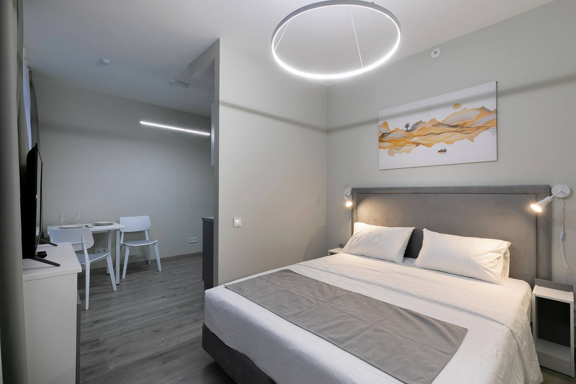 Номера-студии, зонированные стеной-перегородкой. Номера визуально поделены на кухонную и спальную зоны.