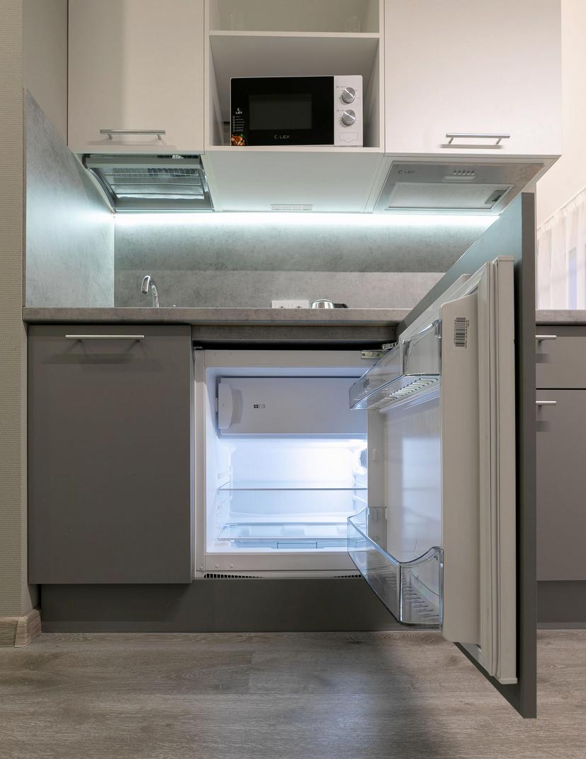 ▪️ Кухонная зона с посудой, принадлежностями для готовки и необходимой техникой: электроплита, чайник, холодильник, микроволновка