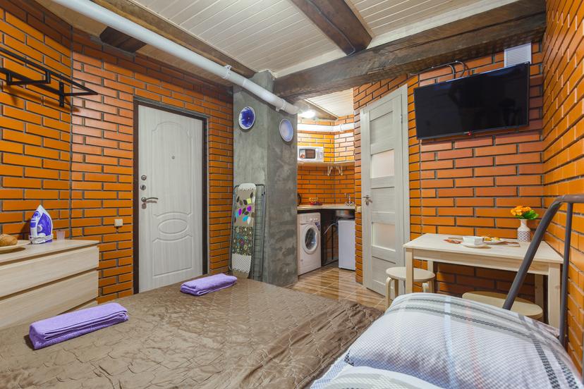 Апартаменты-студия №1 у метро Маяковская. Цокольный этаж, дизайнерский ремонт, 20 м². Двуспальная кровать.